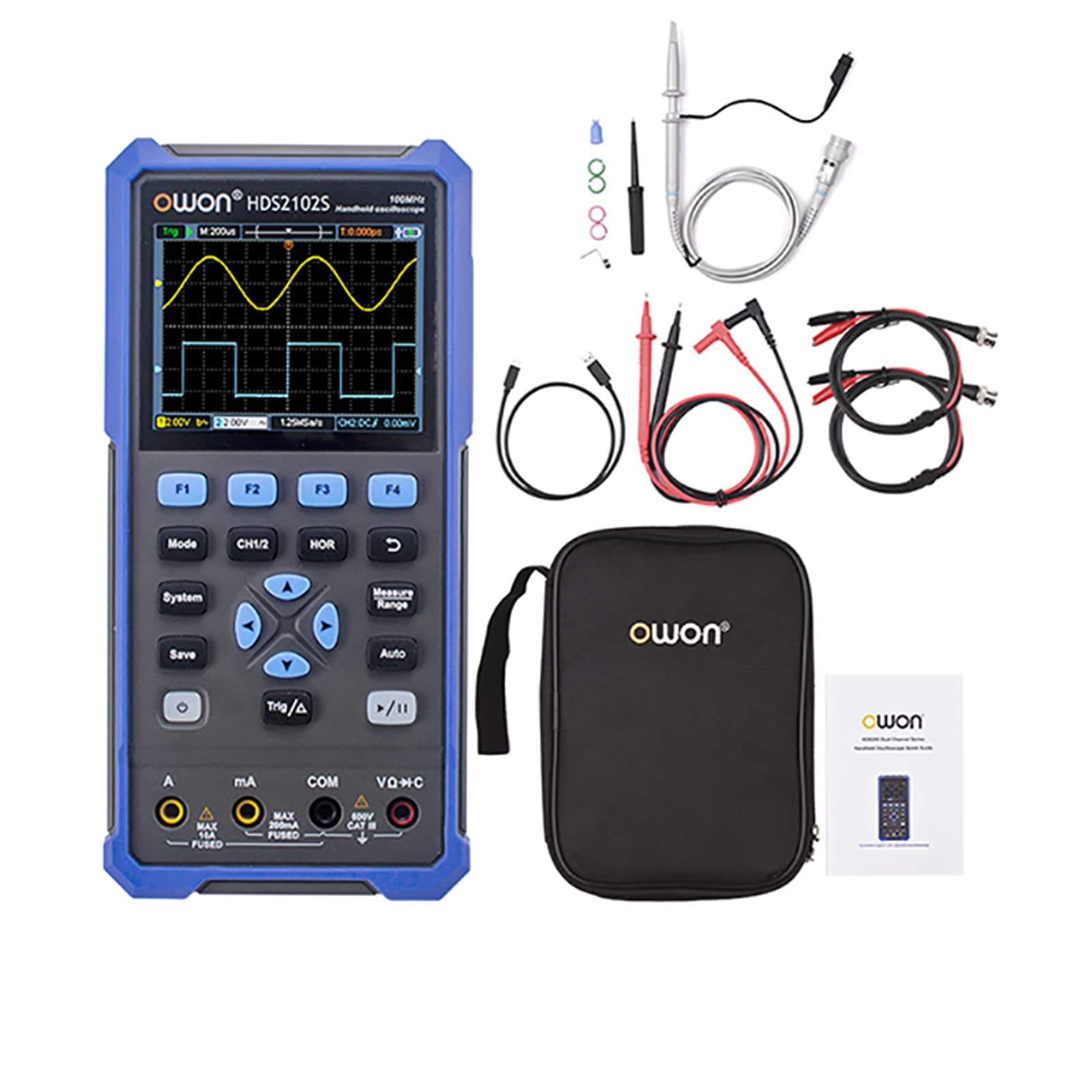 OWON HDS2102S портативный многофункциональный осциллограф-мультиметр, старшая модель в серии аналогичных устройств, составляющих линейку приборов OWON HDS200(S), в которую входят 6 аппаратных реализаций приборов с полосой пропускания: до 40 МГц, до 70 МГц и до 100 МГц (по два варианта исполнения приборов {с встроенным генератором и без генератора} для каждого значения верхнего предела полосы пропускания).