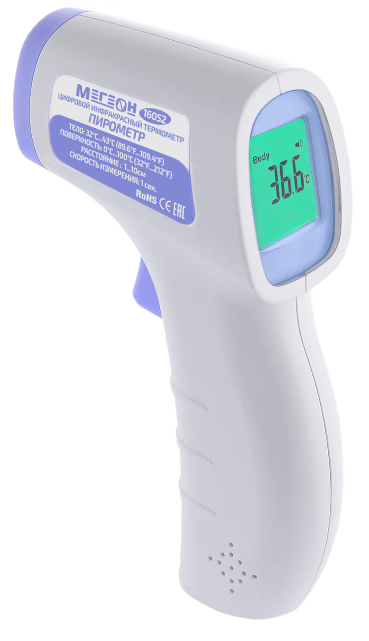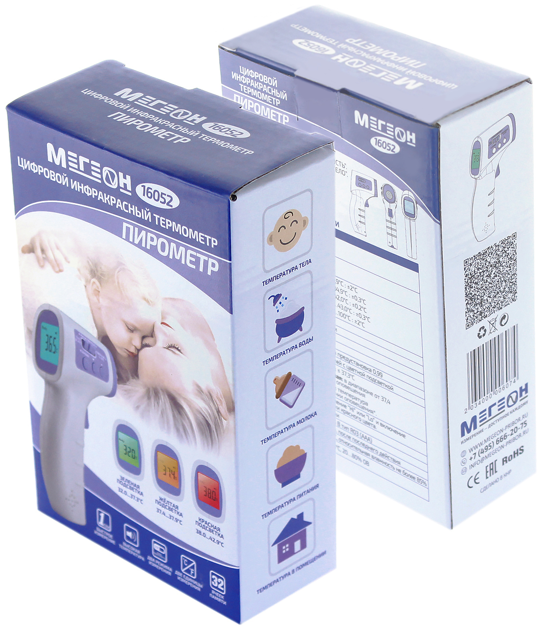 МЕГЕОН 16052 - бесконтактный термометр (градусник), который предназначен для работы в бытовых условиях. Термометр даёт возможность с высокой точностью провести измерения температуры тела в диапазоне от 32°С до 43°С, продуктов питания и воды в диапазоне от 0 до 60 °С. В режиме измерения температуры тела прибор имеет подсветку дисплея, которая меняет цвет от зелёного к красному в зависимости от измеренной температуры тела. Имеется возможность установки порога звуковой и световой сигнализации. Память прибора позволяет сохранять до 32 измеряемых значений. Также термометр оснащён функцией автоматического отключения, что в свою очередь значительно экономит заряд батарей. Таким образом бесконтактный инфракрасный термометр (пирометр) МЕГЕОН 16052 станет незаменимым помощником родителей при уходе за детьми.